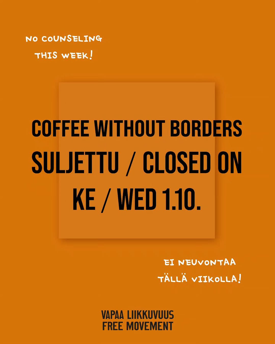 Unfortunately, we have to cancel our cafe and counselling this week. Booked appointments will be moved. You can make an appointment for counselling for future weeks by sending us an email vapaaliikkuvuus(at)gmail.com.
