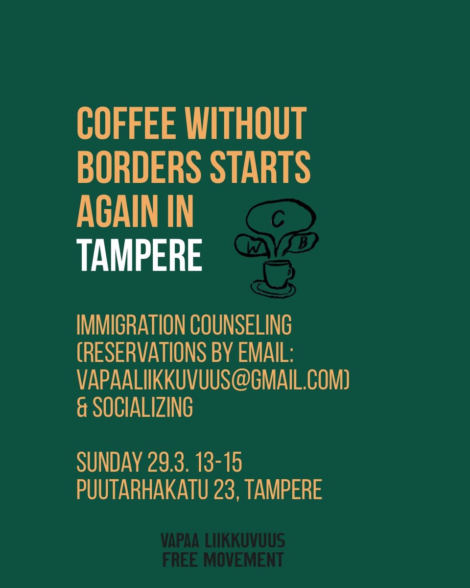 We welcome you to join us at the first Coffee Without Borders event in Tampere on Sunday 29.3. at 13-15 in Puutarhakatu 23 (Lähi-Idän Naisten Yhdistys Ry).