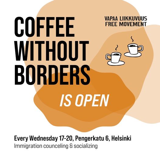Vapaa Liikkuvuuden CWB-kahvila ja maahaanmuuttoneuvonta (oleskeluluvat, palvelut, turvapaikka) ovat auki joka keskiviikko klo 17-20 osoitteessa Pengerkatu 6 (Lymy-tila). Voit halutessasi varata ajan neuvontaan etukäteen kasvokkaista tai etäneuvotaa varten sähköpostilla (vapaaliikkuvuus(a)gmail.com) tai Facebook– tai Instagram -viestien kautta – tai tulla vain käymään.