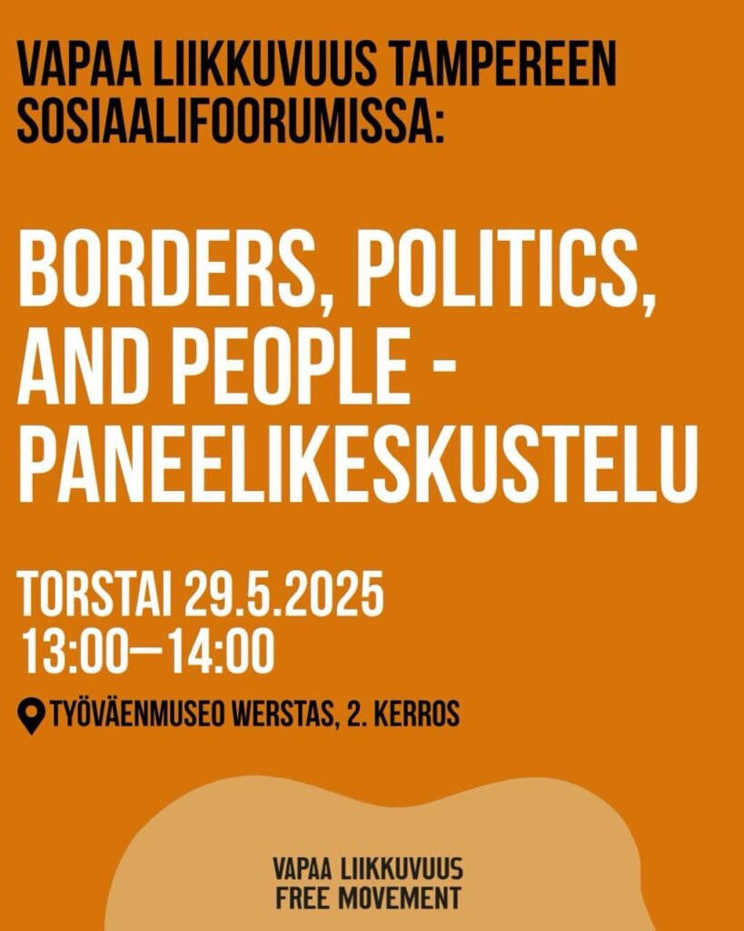 Vapaa Liikkuvuus on Suomessa toimiva aktivistiverkosto, joka kannattaa yleistä liikkumisen vapautta ja perusoikeuksien toteutumista ihmisen statuksesta ja taustasta riippumatta. Verkoston Tampereen toimintaryhmä on vastikään perustettu uudelleen ja toivottaa uudet jäsenet tervetulleiksi. Lisätietoja tapahtuman päätteeksi.