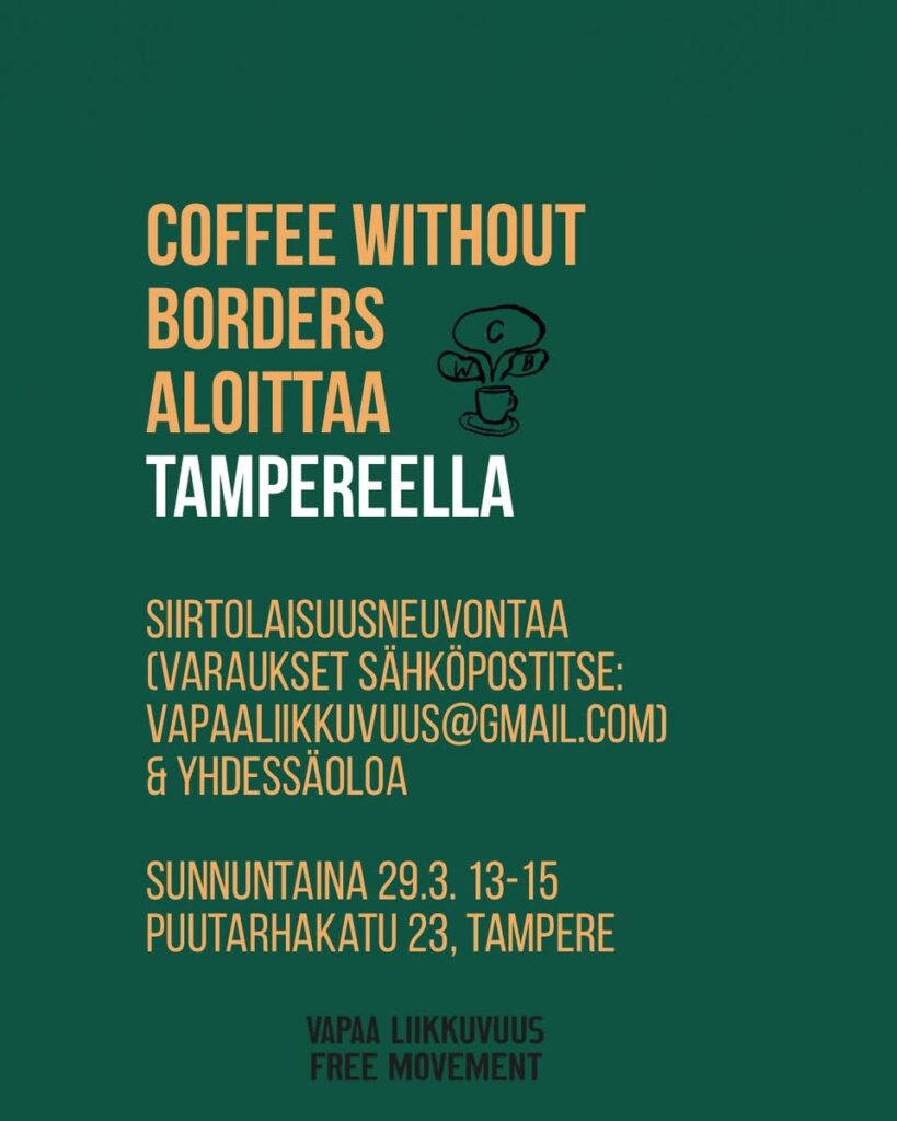 Helsingissä jo vakiintunut toiminta alkaa myös Tampereella! Toivotamme teidät tervetulleiksi ensimmäiseen Coffee Without Borders -tapahtumaan Tampereelle sunnuntaina 29.3. kello 13-15 Puutarhakatu 23 (Lähi-Idän Naisten Yhdistys Ry).
