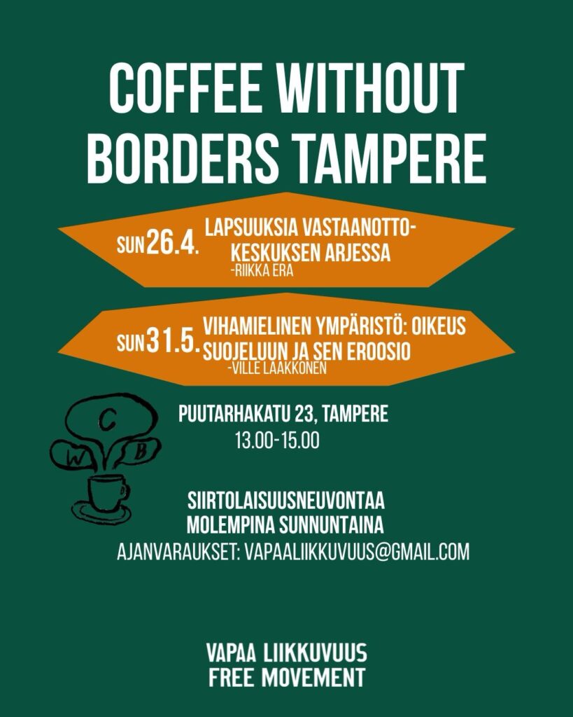 Ajanvarauksella vapaaliikkuvuus(at)gmail.com kautta tarjoamme myös molemmilla kerroilla neuvontaa siirtolaisuuteen liittyviin kysymyksiin. Lue lisää meidän tarjoamasta neuvonnasta ja Coffee Without Borders -tapahtumasta kiinnitetyistä postauksista!