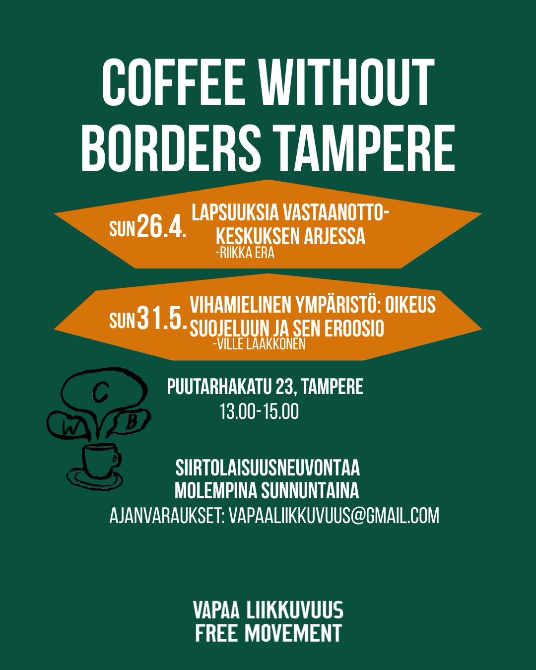Toivotamme teidät tervetulleiksi Tampereen loppukevään Coffee Without Borders -tapahtumiin sunnuntaina 26.4. ja 31.5. kello 13-15 Puutarhakatu 23 (Lähi-Idän Naisten Yhdistys Ry). Nähdään siellä! 🧡